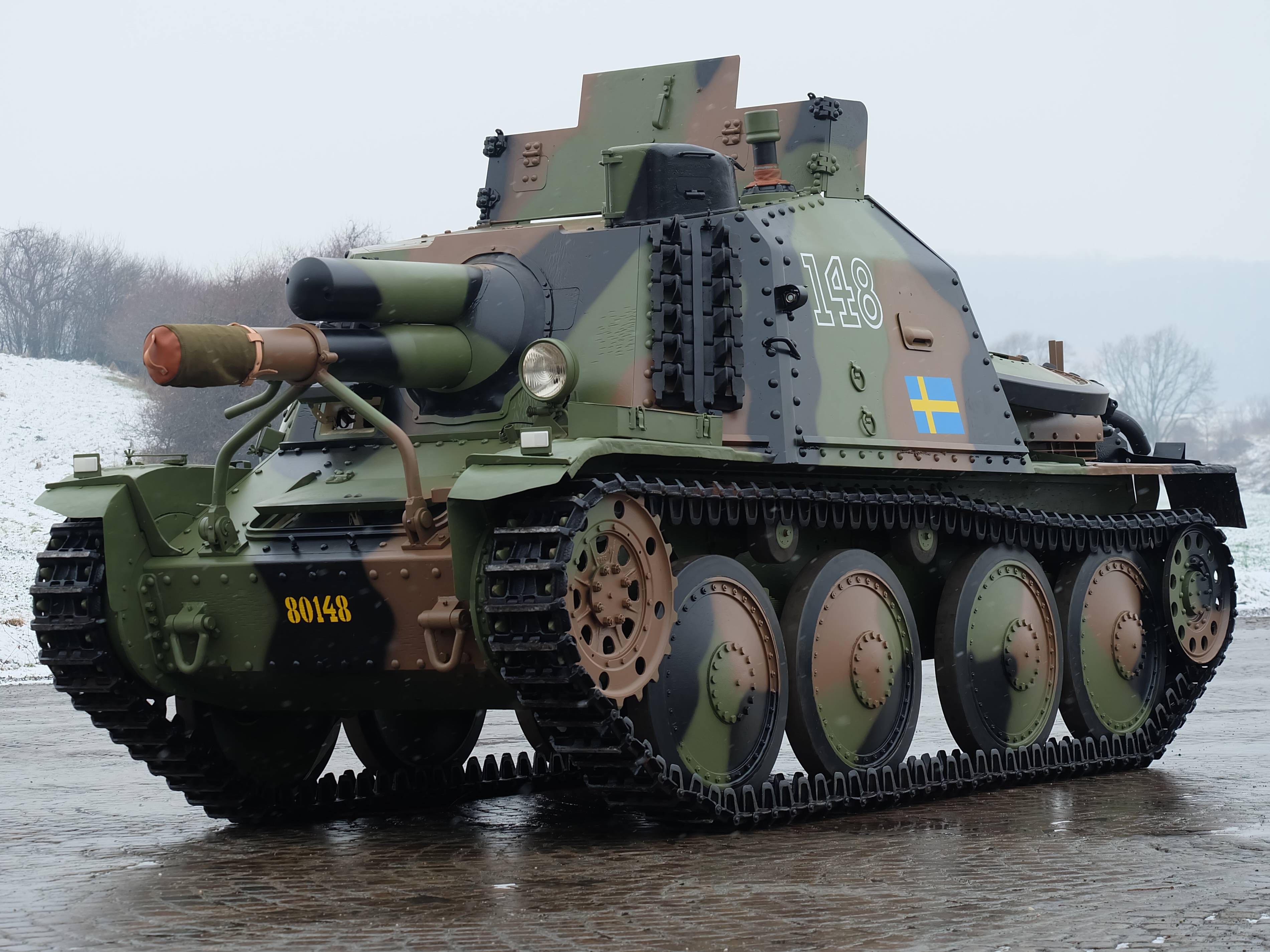 Sav m/43 byl vyráběn na podvozku švédského lehkého tanku Strv m/41, což byla licenční podoba tanku LT vz. 38. Posádku stroje tvořili čtyři muži. V letech 1944-1947 bylo vyrobeno 36 kusů samohybných děl a Švédská armáda je měla ve výzbroji do roku 1973. Do sbírek jej VHÚ získal v rámci výměny techniky ze Švédska.